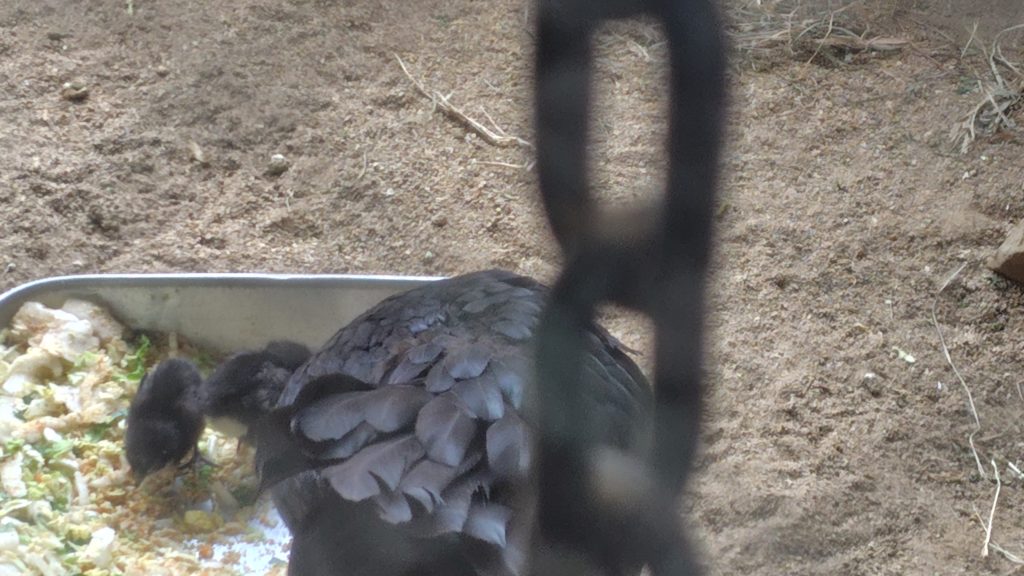たぶんバックヤード(?)をこっそり覗いたら、お母さんの足元に可愛い真っ黒なヒヨコちゃんが2羽いました!